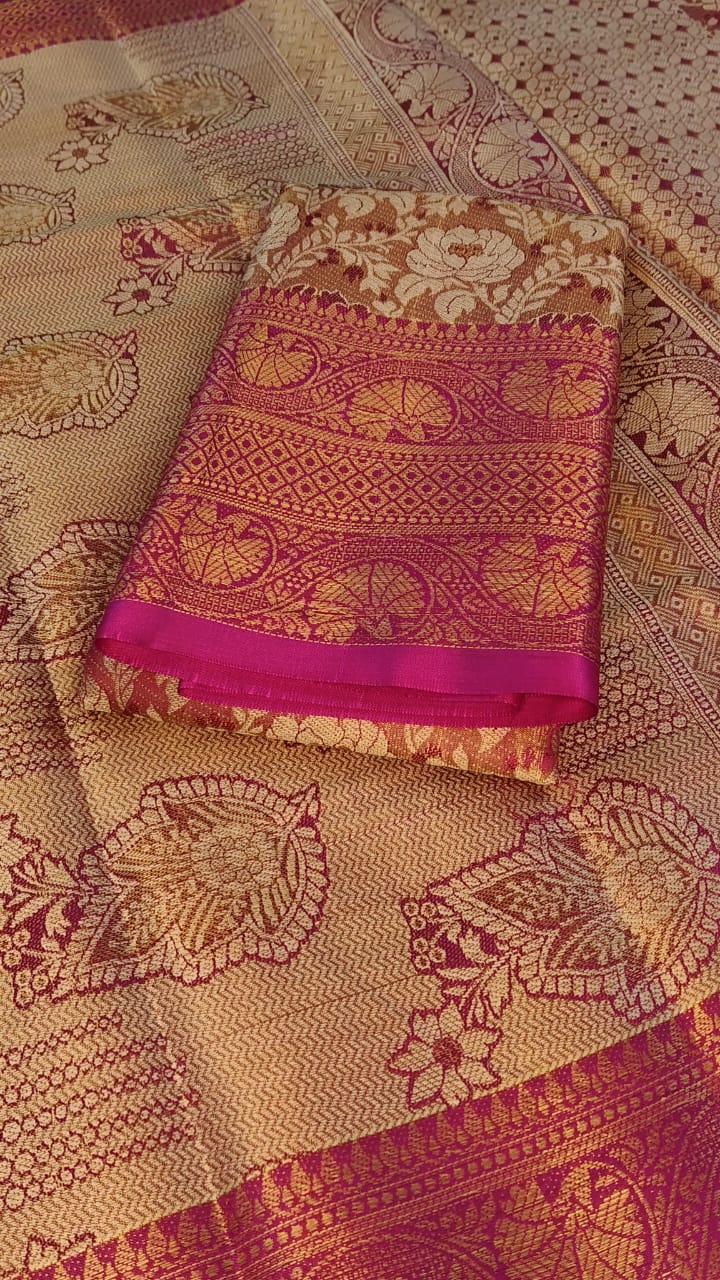 A stunning gold-dominant silk saree where the body is richly woven in a bright, Warm Gold/Beige with large, elegant floral and leaf buttas. The borders and the folded pallu are in a striking, rich Magenta/Deep Pink tone, densely covered in intricate gold zari weaving that features complex floral and diamond patterns. The all-over weaving and luxurious color contrast make this an exceptional choice for any grand occasion.