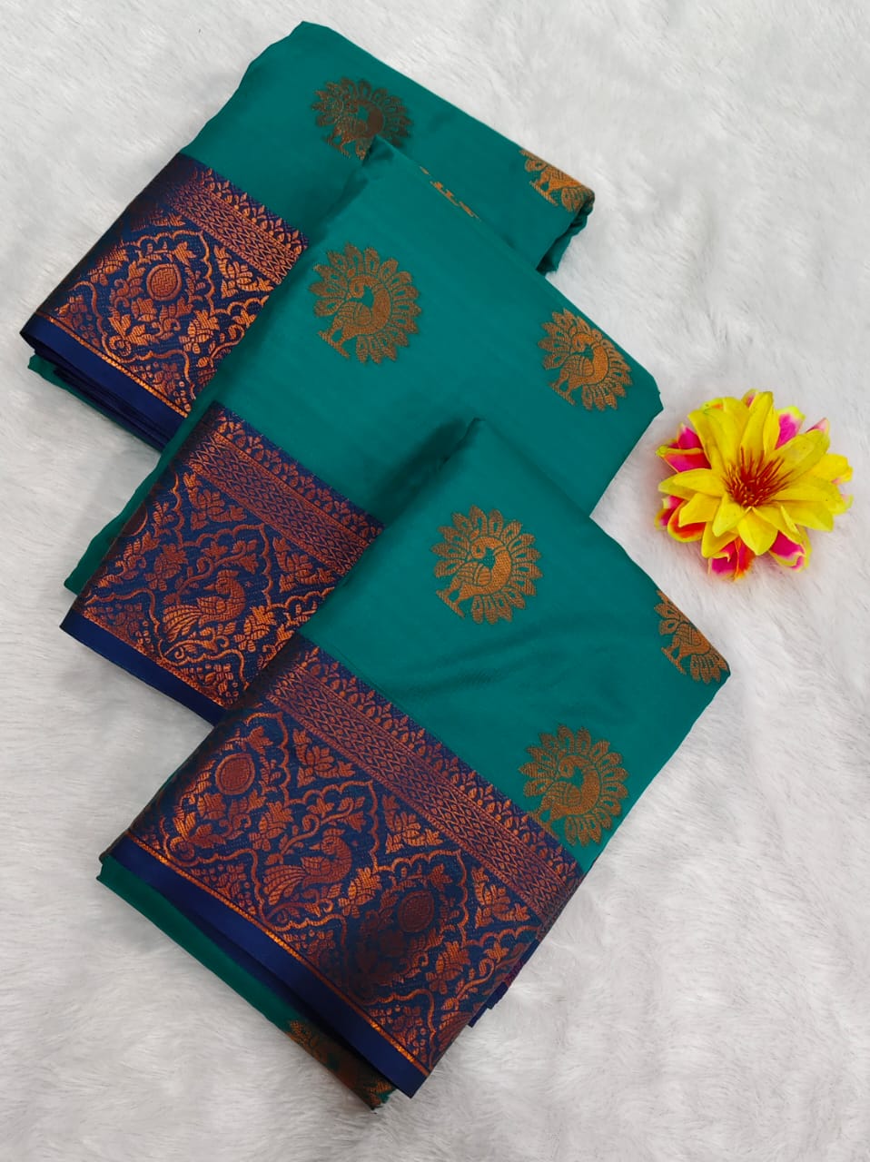 A stunning woven silk saree in a deep, sophisticated Forest Green body color, featuring small woven peacock buttas in gold thread. The saree is contrasted sharply by a wide Deep Red border, which is heavily brocaded with magnificent Peacock and stylized temple motifs in rich gold zari. This is a timeless, regal combination ideal for weddings and formal events.