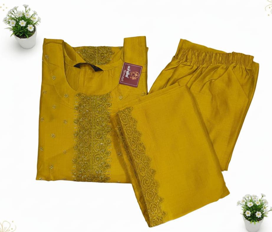 An elegant and festive 3-piece Kurti Set in a rich Mustard Yellow silk-blend fabric. The straight Kurti features heavy, intricate gold thread and sequin embroidery along the yoke/placket. It is complemented by matching plain Trousers and a solid Dupatta finished with matching lace/embroidery on the border. Ideal for Sangeet or evening parties.
