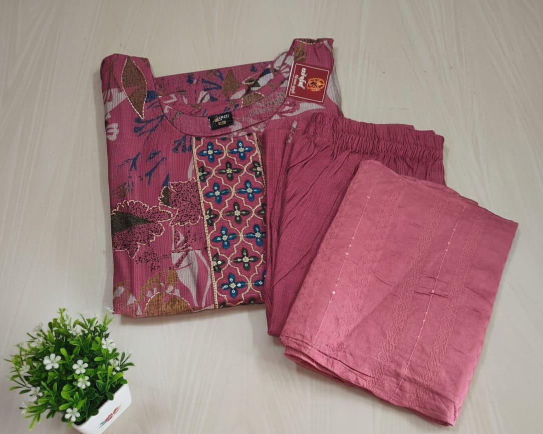 A stylish 3-piece Kurti Set in a soft Mauve/Dusty Pink tone. The Kurti features a large floral print offset by a central geometric and embroidered yoke design. It comes with matching comfortable Palazzos and a coordinating, textured Dupatta. Ideal for office wear and smart-casual events.