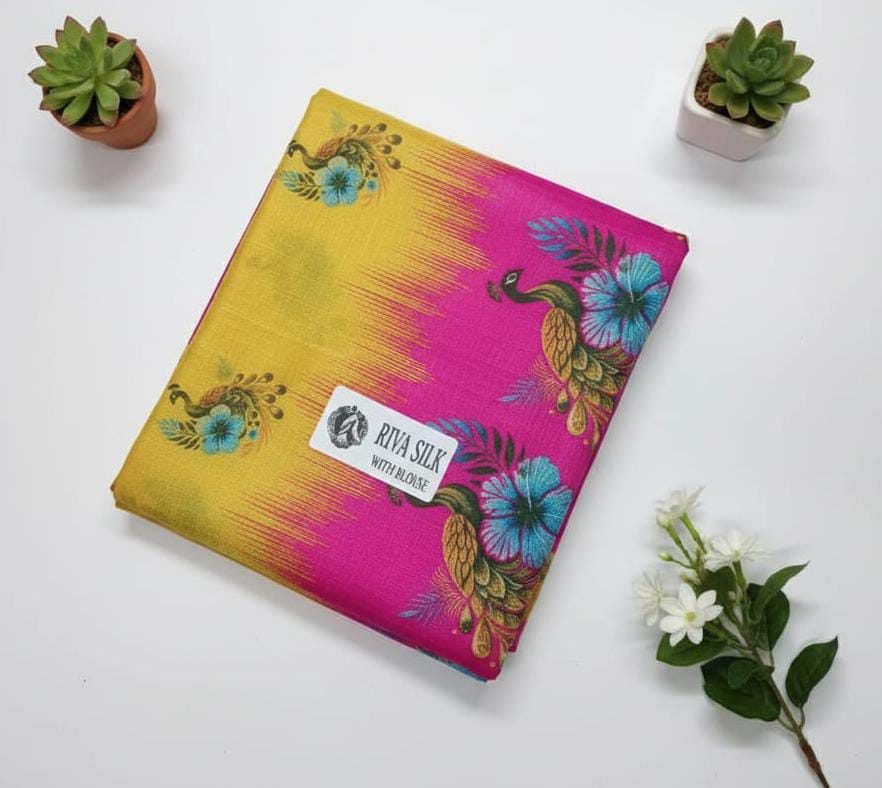 This striking Fancy Silk saree combines bright, cheerful colors with traditional motifs. The saree is split between a bright sunshine yellow and a vivid rani pink (hot pink), separated by a subtle gradient effect. It is decorated with intricate peacock and large blue floral prints that bridge the two colors. This vibrant and playful saree is perfect for festive occasions and celebrations. Includes a blouse piece.
