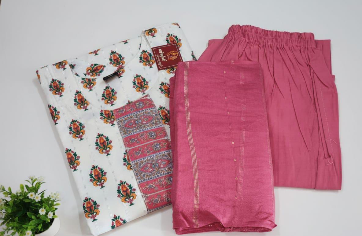A cheerful 3-piece Kurti Set featuring a pure white Kurti adorned with bright Orange and Green floral block prints. It is beautifully paired with comfortable, elasticated Rani Pink Palazzos and a matching Pink Dupatta with subtle gold stripe accents. Perfect for festive daytime gatherings and casual outings.